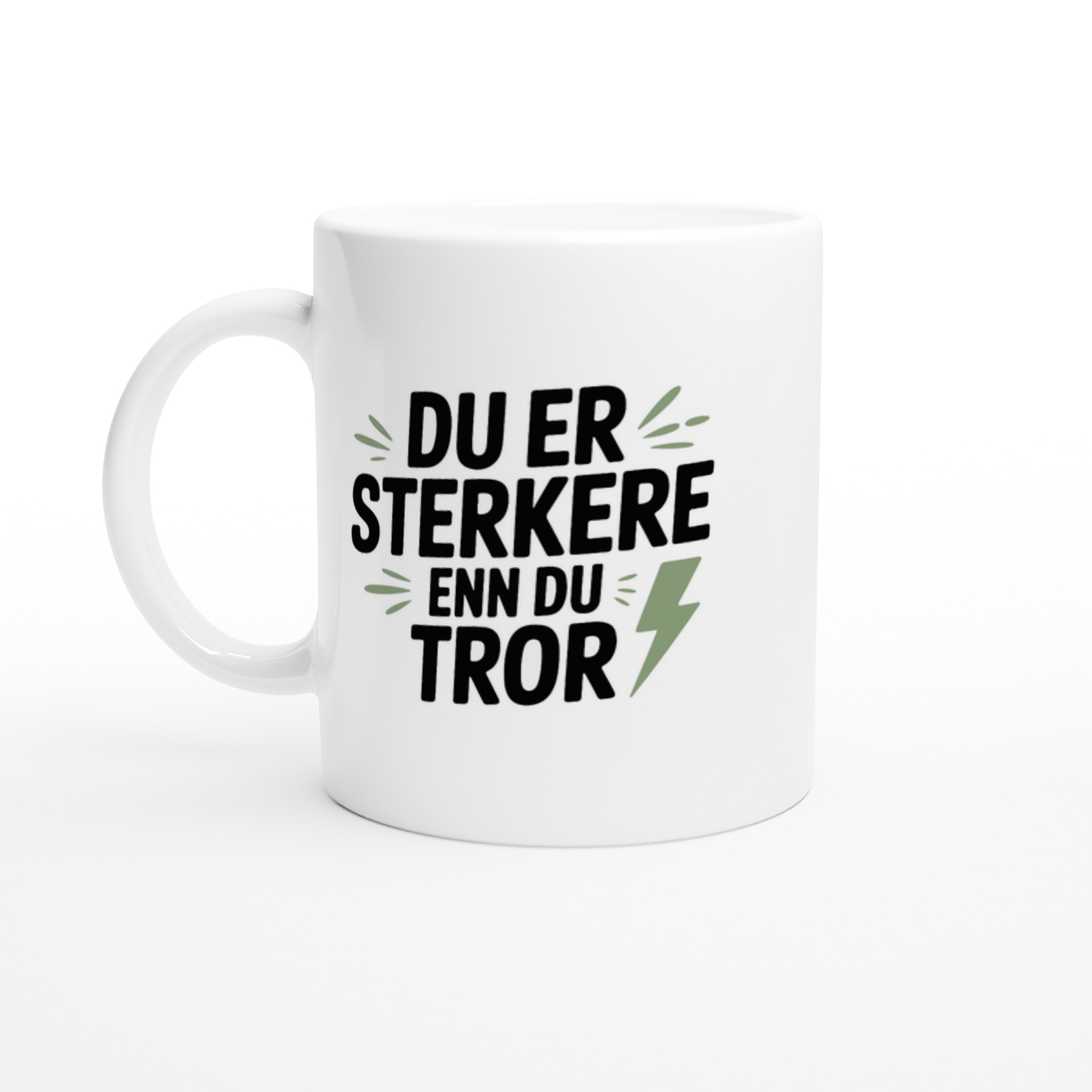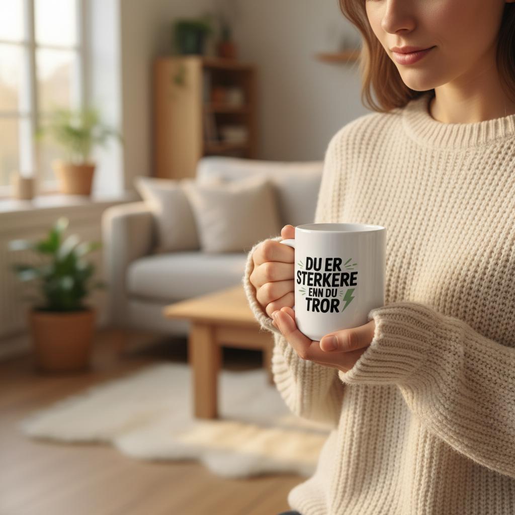 Gi bort en kopp som faktisk betyr noe. “Du er sterkere enn du tror” gjør den til en gjennomtenkt gave for bursdag, oppmuntring, eller bare en hyggelig overraskelse.