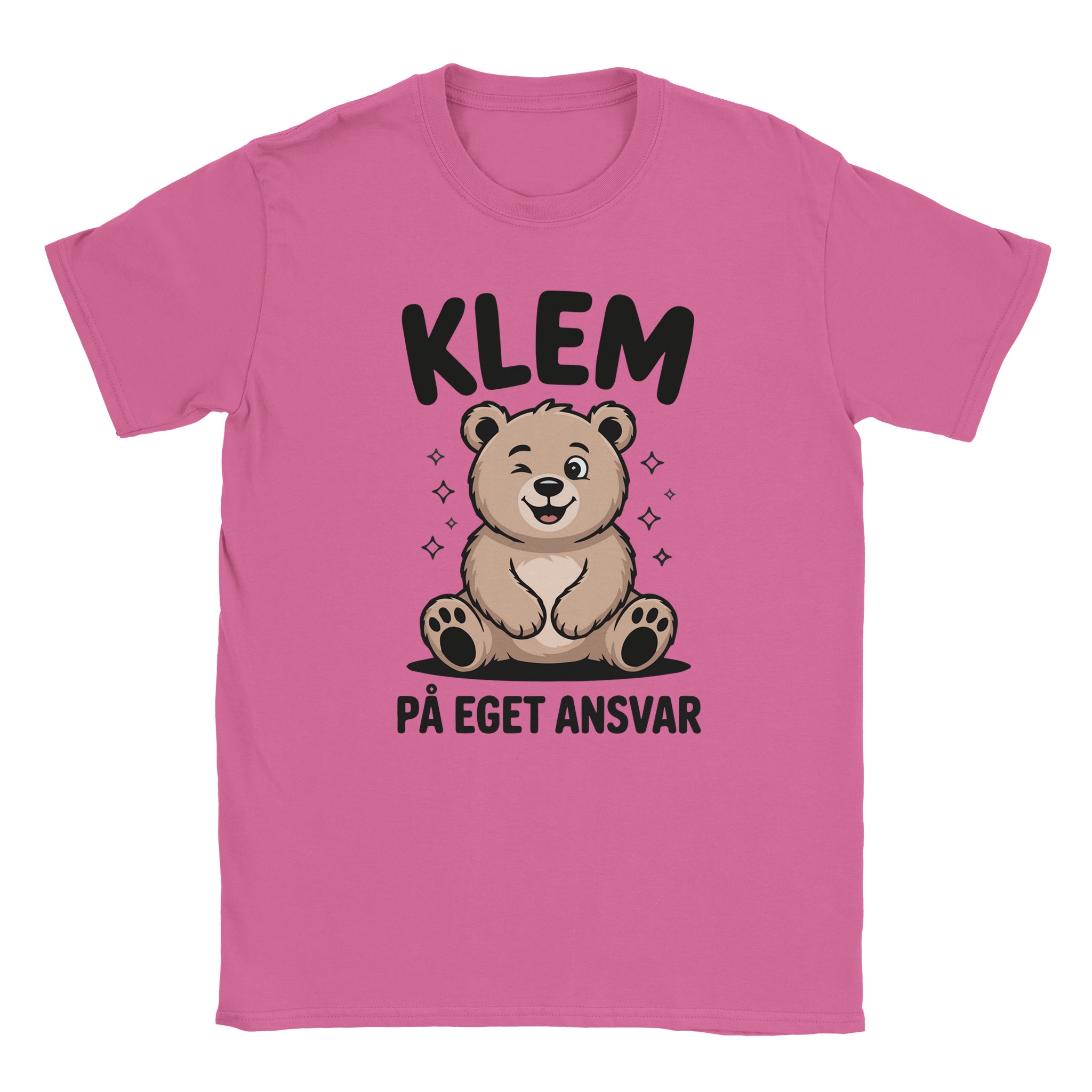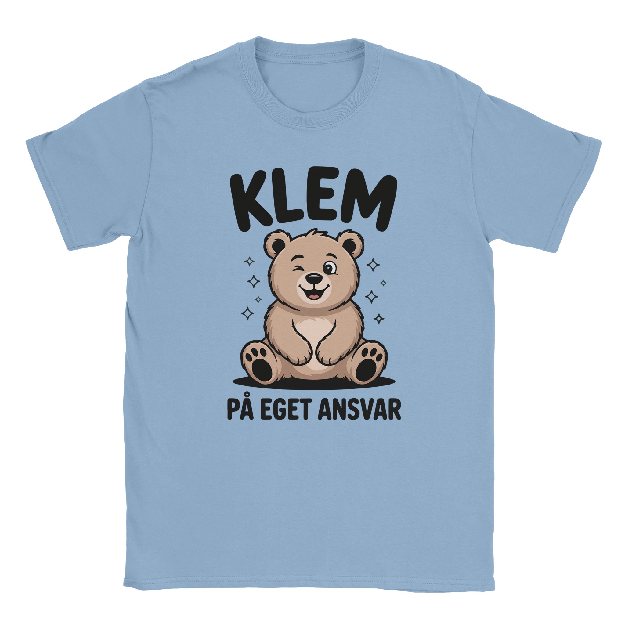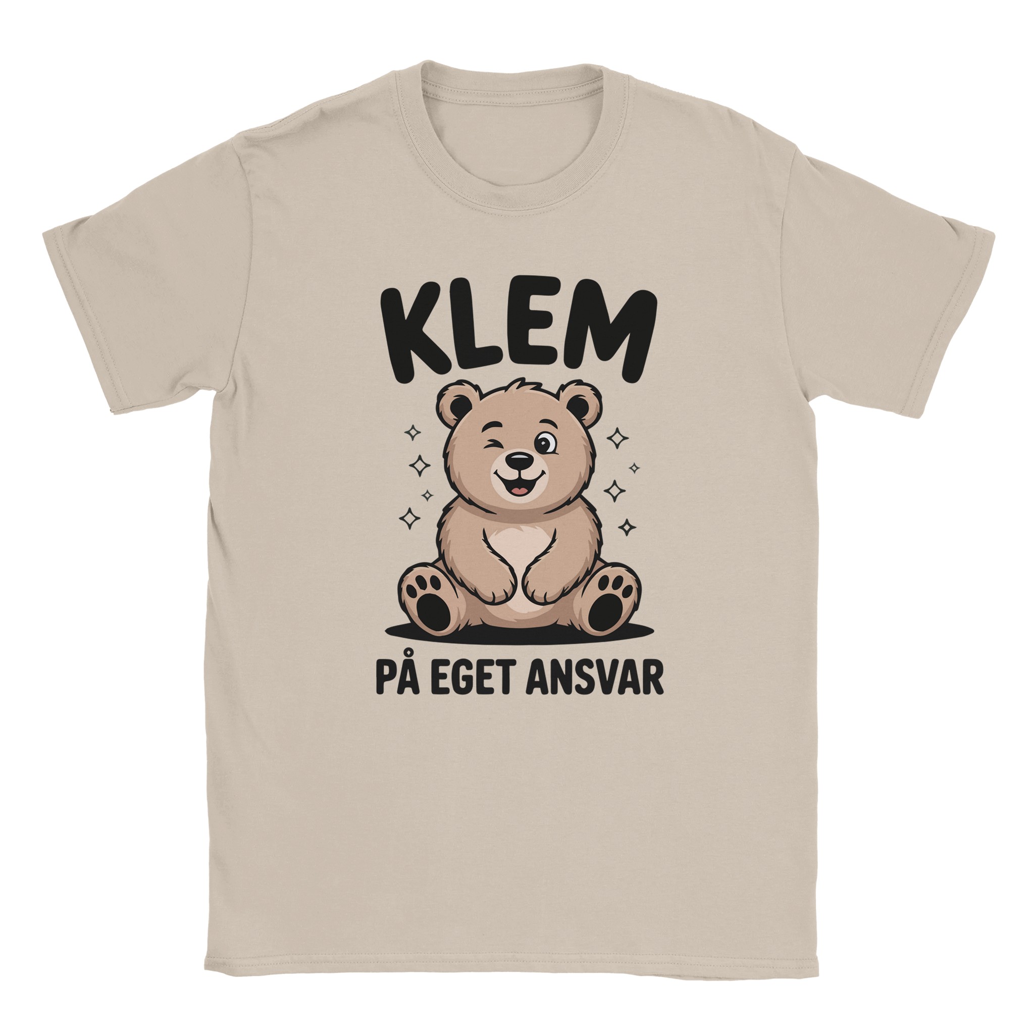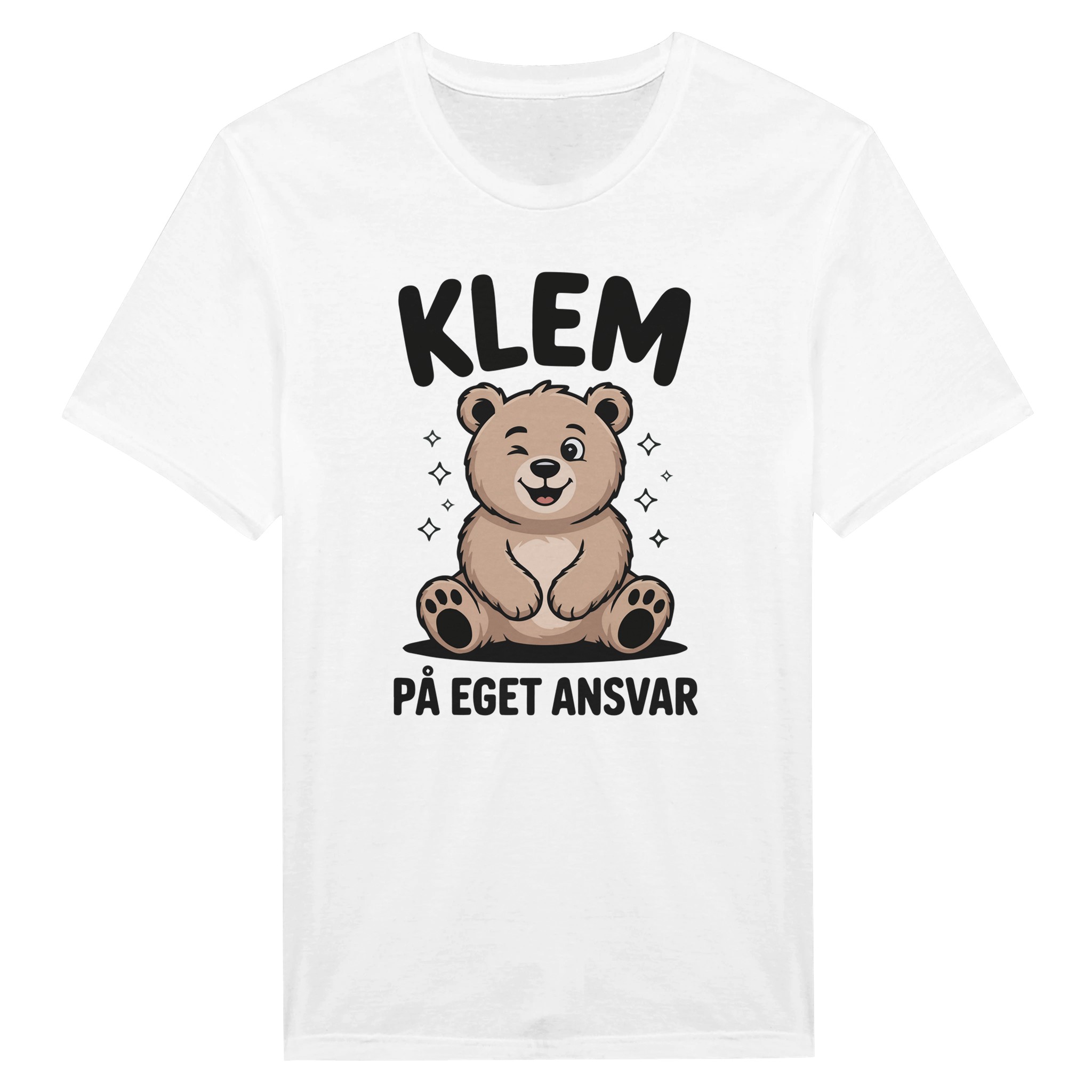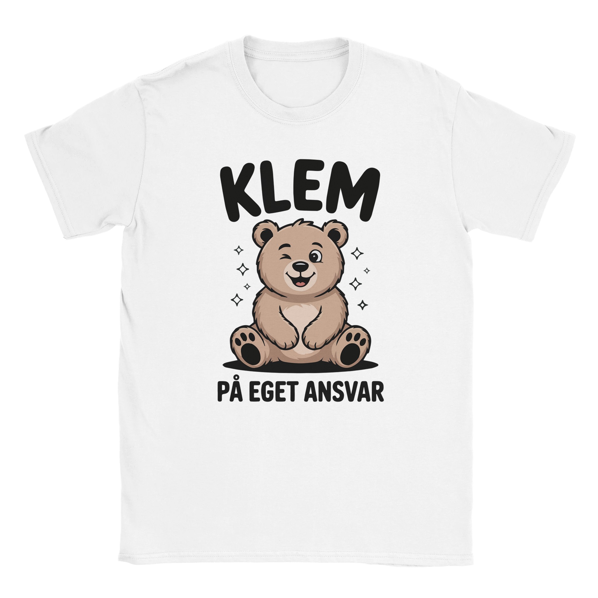 Denne t-skjorten er for deg som vil spre både humor og varme på samme tid. Motivet viser en søt bjørn som blunker, sammen med teksten «Klem på eget ansvar» i tydelig, håndskrevet font.